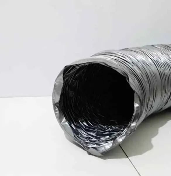 - لایه خارجی آلومینیوم 230 میکرون: لایه خارجی کانال تهویه هوا فلکسیبل از آلومینیوم با ضخامت 230 میکرون تشکیل شده است. آلومینیوم بهعنوان یک فلز سبک و مقاوم در برابر حرارت و آتش شناخته میشود. این لایه به کانال تهویه هوا فلکسیبل مقاومت مکانیکی و حفاظت فیزیکی میبخشد و در مقابل خطرات محیطی مانند ضربهها و خوردگی محافظت میکند.