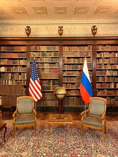 عکس دو صندلی را نشان میدهد که پرچمهای روسیه و آمریکا درست در پشت آن قرار دارند و قفسههای چوبی پر از کتاب در پس زمینه دیده میشود. در زیرنویس آمده است: "همه چیز برای مذاکره آماده است: اینجا جایی است که روسای جمهور روسیه و آمریکا، ولادیمیر پوتین و جو بایدن ، فردا صحبت خواهند کرد".