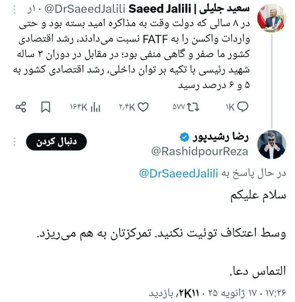 کدخبر: ۱۳۳۴۵ ۱۴۰۳/۱۰/۲۸ ۲۲:۱۵:۴۲ واکنش به توییت سعید جلیلی توییت سعید جلیلی در وسط مراسم اعتکاف سوژه کاربران شده است قلیان در میرداماد ؛ تجربه لوکس شبانه در کافه لید در طبقه vip پایگاه خبری تحلیلی رستانیوز: آنچه دیگران میخوانند: قیمت شوکه کننده دلار آزاد اول صبح شنبه ۱۵ آذر شارژ کالابرگ الکترونیک با واریزی جدید | سورپرایز دولت برای روز مادر + کد استعلام! ویژه: قیمت شوکه کننده دلار آزاد اول صبح شنبه ۱۵ آذر سعید جلیلی واکنش مراسم وسط توییت کپی شد آیا این خبر مفید بود؟ 0 0