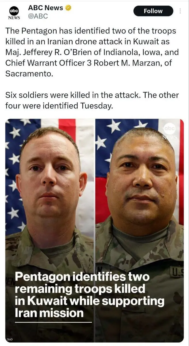 وزارت جنگ آمریکا هویت ۲ نفر دیگر از نظامیان خود را که در جریان حملۀ ایران به مواضع آمریکا در کویت کشتهاند، فاش کرد.