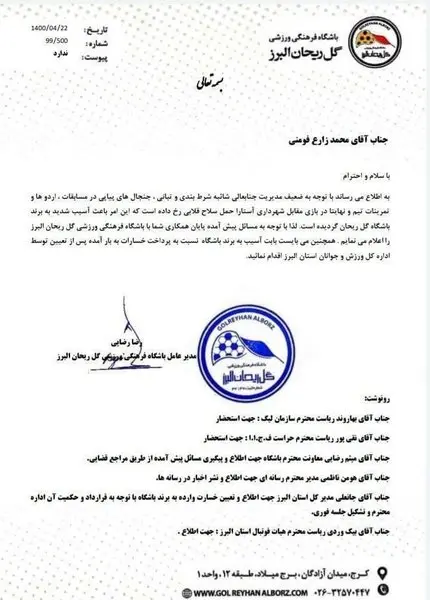 پس از اتفاقات شب گذشته در جریان دیدار دو تیم گل ریحان البرز و شهرداری آستارا که منجربه کشف یک قبضه اسلحه قلابی از محمد زارع فومنی که مدیریت تیم فوتبال بزرگسالان این باشگاه را بر عهده داشت، مدیرعامل باشگاه حکم برکناری او را صادر کرد.