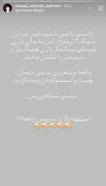 صمد نیکخواه بهرامی کاپیتان تیم ملی بسکتبال کشورمان در واکنش به عدم پخش بازی تیم ملی استوری تندی را در صفحه خود قرار داد.