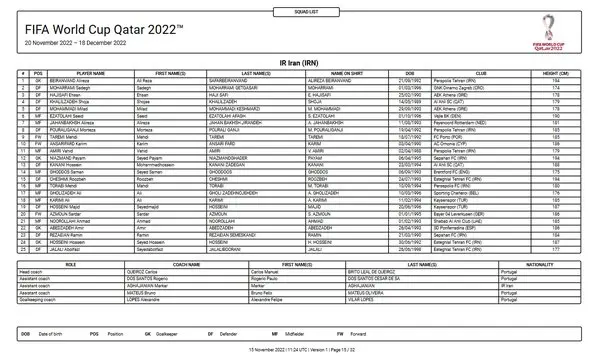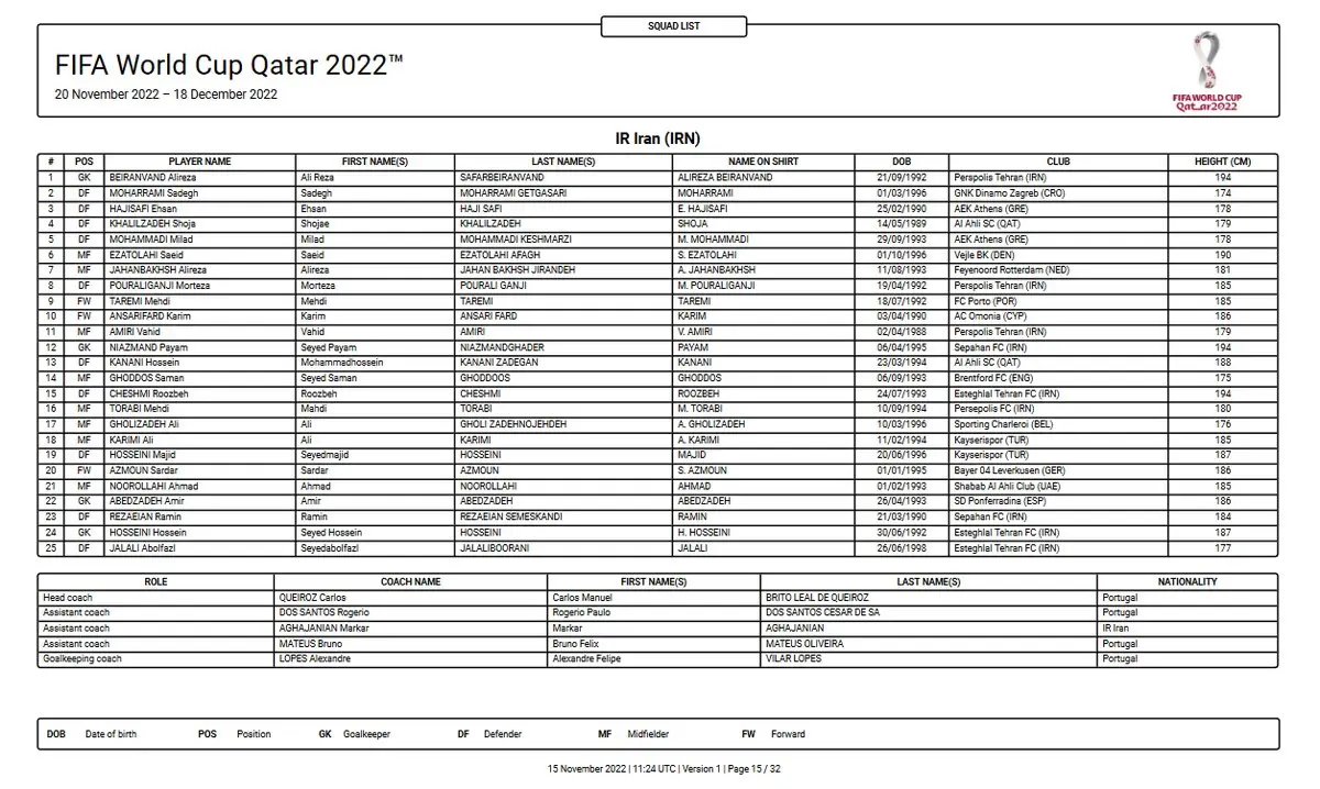 لیست کلی بازیکنان تیم ملی فوتبال کشورمان در مسابقات جام جهانی 2022 منتشر شد.
