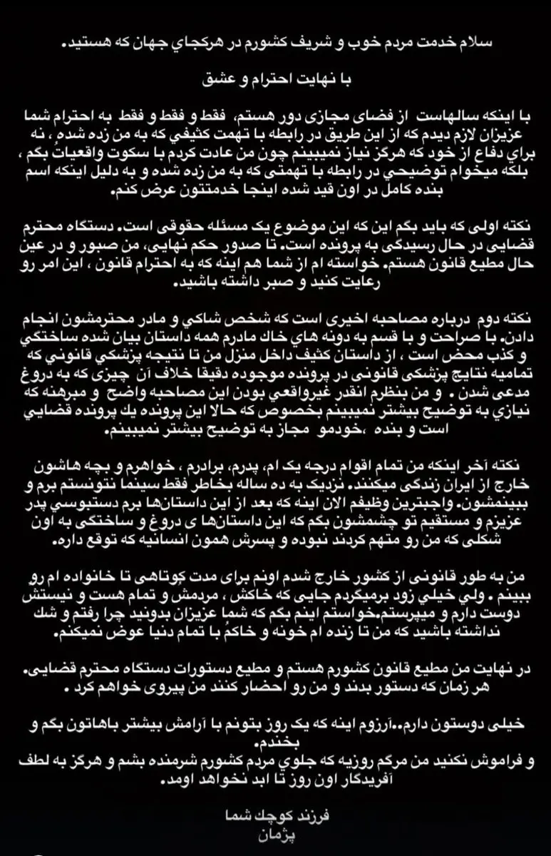 واکنش پژمان جمشیدی به مصاحبه شاکی و خبر خروج از کشور: مصاحبه شاکی و مادرش، از داستان داخل منزل تا نتیجه پزشکی قانونی غیر واقعی است/ من به طور قانونی از کشور خارج شدم و خیلی زود برمیگردم