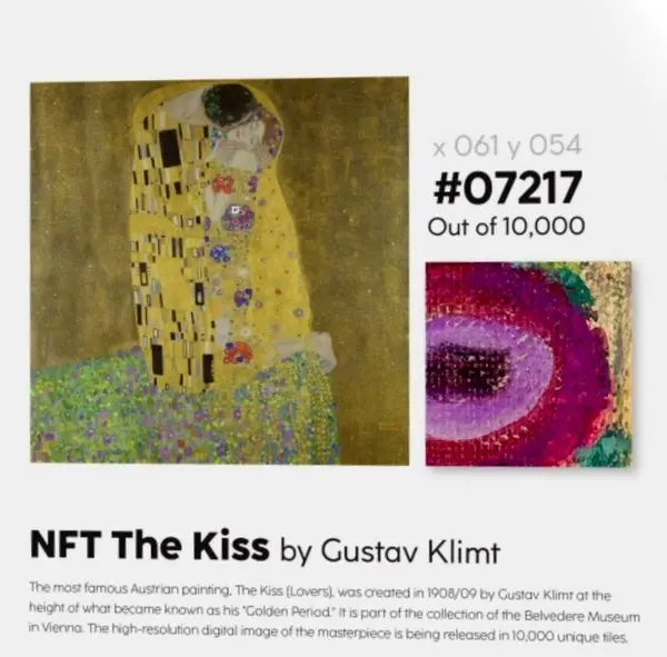 برای اولین بار در جهان شاهکار هنری 'بوسه' اثر نقاش و هنرمند بنام اتریشی، 'گوستاو کلیمت'، توسط موزه Belvedere، که یکی از بزرگترین موزههای اتریش است، از طریق شرکت arteQ به صورت NFT به دنیای متاورس عرضه میشود.