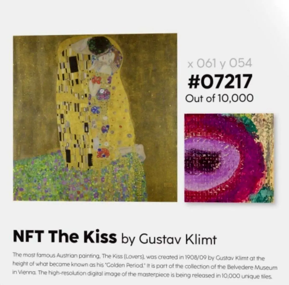 موزه Belvedere اتریش و شرکت arteQ برای اولین بار اثر زیبای ‘بوسه’، شاهکار هنرمند اتریشی، ‘گوستاو کلیمت’ را بصورت NFT در ۱۰،۰۰۰ قطعه به دنیای بلاکچین و متاورس معرفی میکنند.